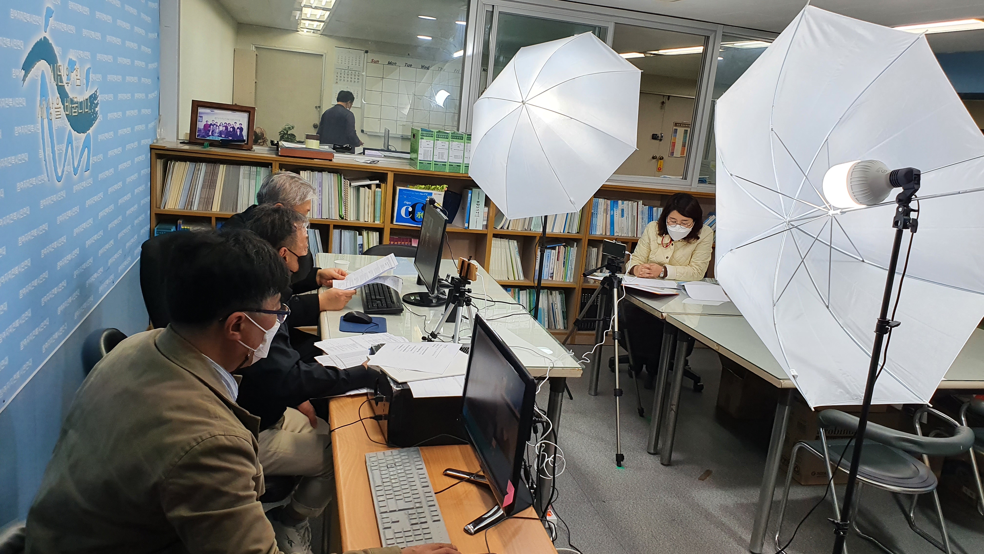 코로나19가 우리사회의 많은 변화를 가져다 준 모습 중 하나, 총회를 온라인으로 진행하기 위한 서면의결 안내 영상 촬영을 하고 있는 모습이다. 참여자치전북시민연대 창립 이래 첫 서면 총회다 보니 많은 걱정이 앞선다. 정족수 부족으로 총회가 무산되면 어쩌나. 서면의결서가 최대한 간단해야한다, 그렇다고 안건 내용이 형식적이면 안 된다. 회원들과 대면 못하니 인사 영상도 찍어서 올려야 한다 등등. 총회 서면의결 창을 열어본 회원이라면 35초 남짓한 이 영상을 다 보셨으리라. 회원 분들이 보기 편한 영상을 만들기 위해 NG를 몇 번이나 냈는지..