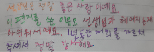 이런 선생님, 저런 선생님이 되겠다는 생각을 수도 없이 쓰고 지워왔다. 이곳은 나에게 어떤 선생님이 되어야겠다는 생각 대신 아이들에게 좋은 사람이 되어야겠다는 마음을 품게 했다. 그런데 오늘 1학년 우리반 아이가 준 편지에 ‘선생님은 정말 좋은 사람이예요.’라고 적혀 있어 눈물이 왈칵 나고 말았다. 나 혼자 품고 있던 말이 아이의 말로 세상에 나온 순간, 생명력 있게 살아나는 걸 느낄 수 있었기 때문이다.