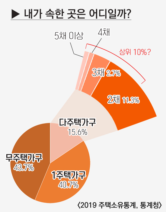통계청의 2019년 주택소유통계1에 따르면 우리나라의 무주택가구 비율은 43.7%, 1주택 소유 가구는 40.7%, 2주택 이상 소유 가구의 비율은 15.6%로 나타났다. 부동산 가격은 끝없이 오른다고 하고 20대 사회초년생까지 ‘영끌’해서 ‘패닉바잉’하고 있다는 언론의 호들갑에 ‘나 혼자만 뒤쳐졌나’하고 걱정할 필요 없다. 열 명 중 8명이 나와 같은 처지다. 지금 당장은 집이 없거나 딱 1채지만 기회만 된다면 주택을 구입할 계획인 사람이 많은데 섣부른 판단을 하고 있다고 의심할 수도 있다. 국세청의 자료2에 따르면 2007년부터 2017년까지 증가한 주택 521만 호 중에 상위 10%가 사들인 주택이 208만 호에 이른다. 이미 다주택자인 사람이 투자목적으로 추가 구입한 주택이 전체 공급물량의 40%를 훌쩍 넘는다는 얘기다. 부동산 시장의 안정을 목표로 했던 공급확대 정책이 투기 수요에 흡수되면서 실수요자의 주택 구매를 돕지도, 가격 안정의 효과도 내지 못했다는 것을 여실히 보여준다.