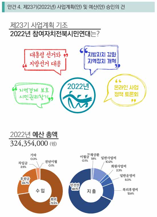 | 안건4. 제23기(2022년) 사업계획(안) 및 예산(안) 승인의 건 | ||