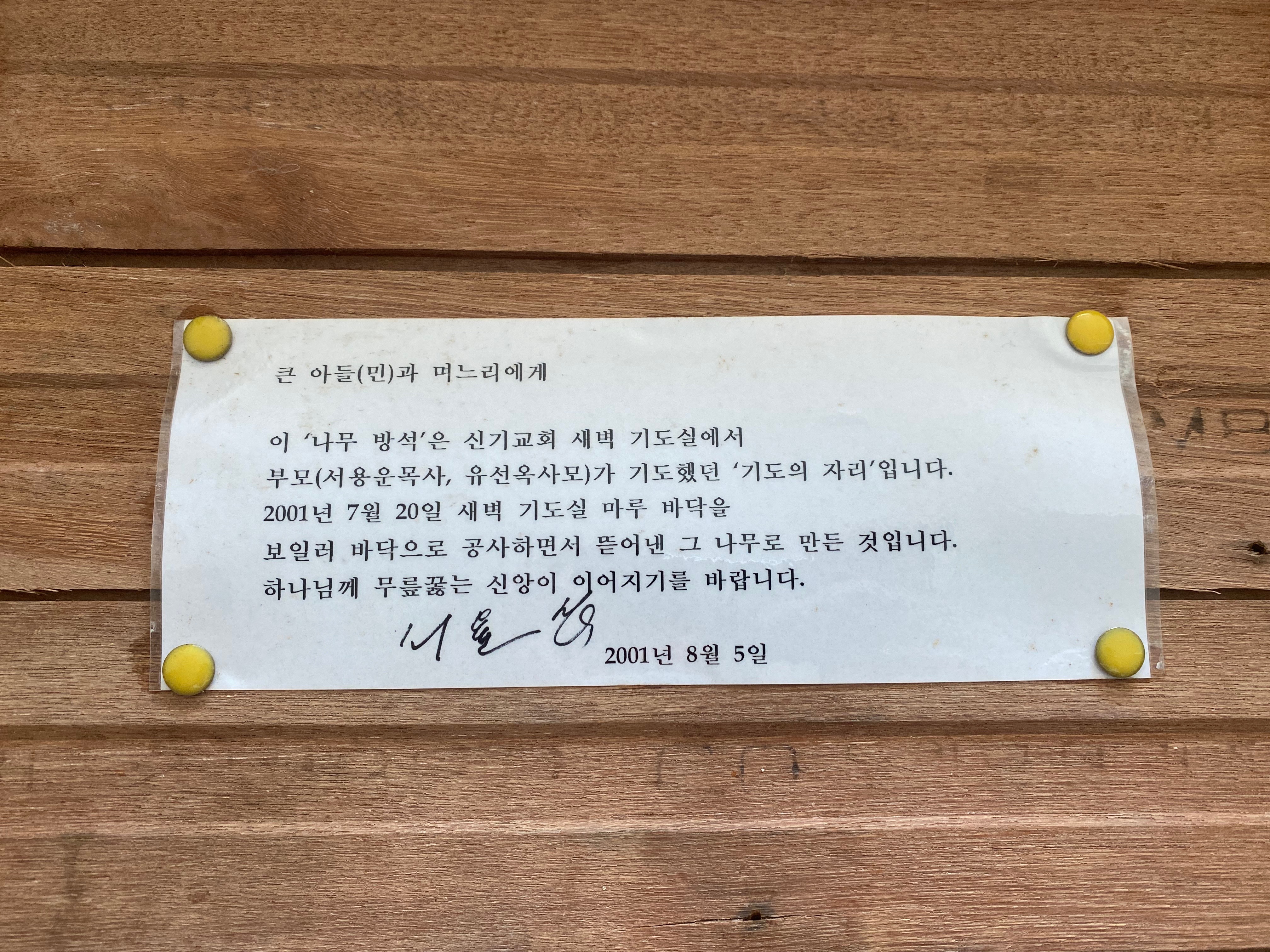 그런데 이십 년 전쯤 되던 해 여름, 기도실 마룻바닥을 뜯어내고 난방을 할 수 있게 보일러를 까는 공사를 하게 되었습니다. 그러다 보니 뜯겨나온 나무 마루판들이 교회 마당에 수북했습니다. 그 가운데 쓸 만한 것들을 골라서 나무 방석을 몇 개 만들었습니다. 박 아무개 교인이 목수 일을 하셨기 때문에 부탁을 드렸고, 저는 두 아들과 함께 투명 페인트칠을 했습니다. 기념해서 사진도 찍었고 나무 방석 안쪽에 뭐라고 써서 붙여놓기도 했습니다. 제가 나무 방석을 만들었던 것은 두 아들이 나중에 며느릿감을 데려오고 결혼을 하게 되면 선물로 주어야겠다고 생각했던 것인데, 그때 아이들이 중학교 때여서 실감이 나지 않았겠지요.