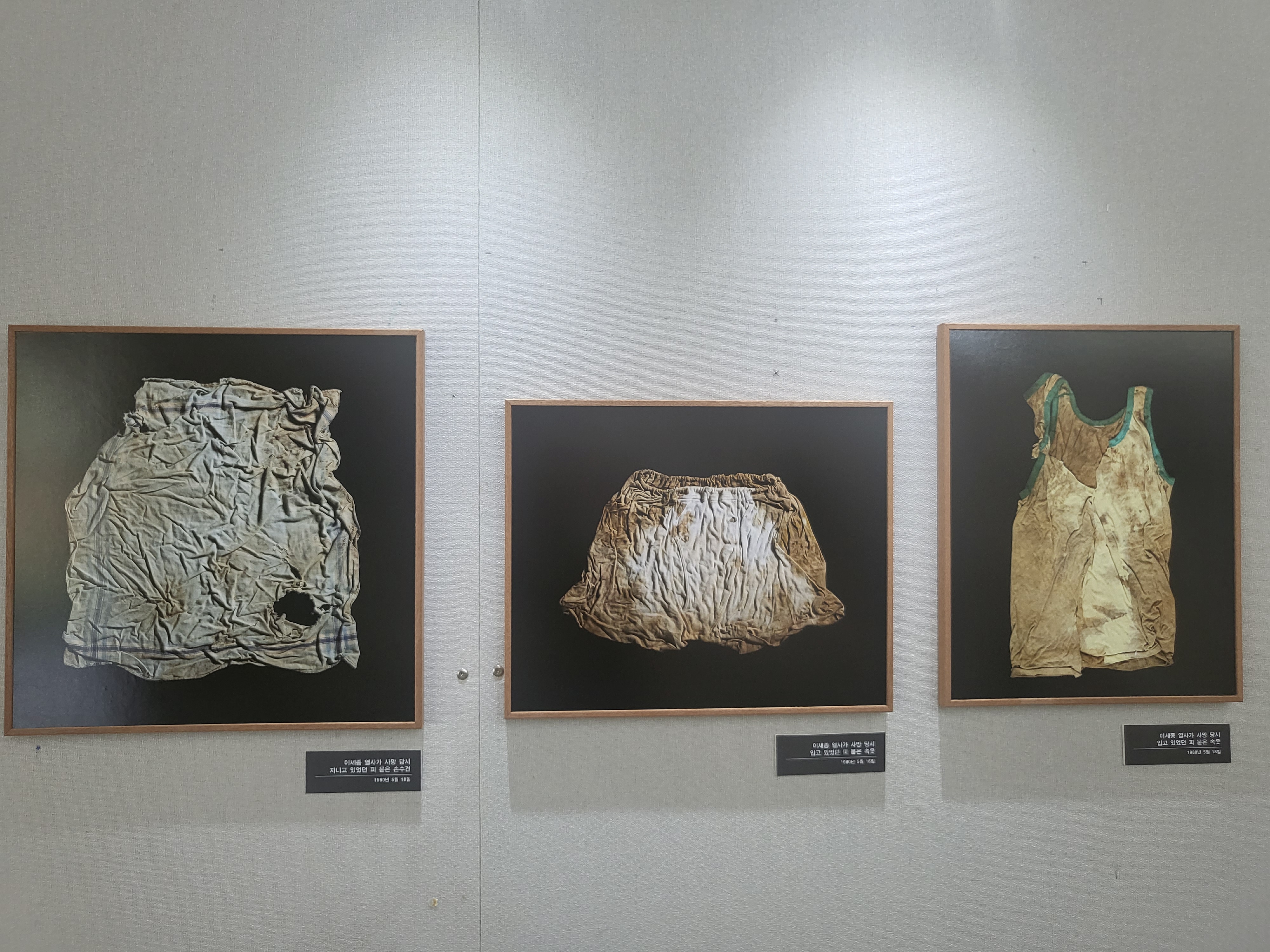 5시 기념식에 앞서 이세종 열사의 유품이 전시되어있는 박물관을 찾았다. 평일이라 그런지 전시관은 한산했다. 떠난 이의 흔적과 남겨진 이들의 방문록이 애달픔으로 숙연하기까지 하다. 전시된 기록물 중 열사의 친필이 남아 있는 고등학교 교재가 눈에 띄었다. 빼곡히 필기한 교재가 꿈 많던 이세종의 모습을 그대로 보여준다. 그리고 그 옆에는 열사가 사망 당시 입고 있었던 피 묻은 속옷과 손수건이 전시되어있다. 평범한 학생 이세종과 열사 이세종은 불과 4년의 세월밖에 흐르지 않았다. 열사가 죽음을 맞이한 나이는, 그렇게 지기에는 너무나도 어린 나이였다.