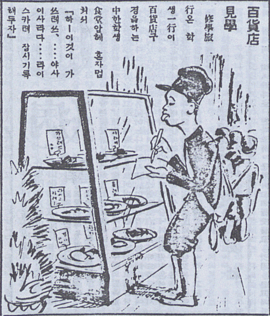 수학여행(修學旅行) 온 학생 일행(一行)이 백화점(百貨店) 구경을 하는 中, 한 학생 식당(食堂) 앞에 혼자멈춰서 「하-이것이 가쓰레쓰,…야사이사라다…라이스카레 잠시기록해두자」
