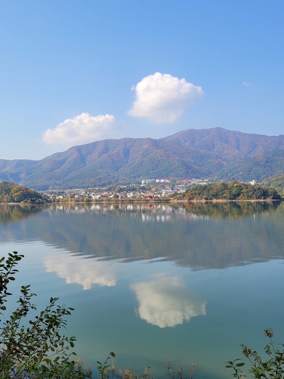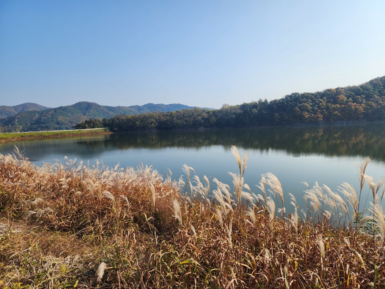 고요한 저수지에 비친 데칼코마니가 아름다운 풍광이 되어 지루할 틈을 주지 않는 멋진 길입니다.^^