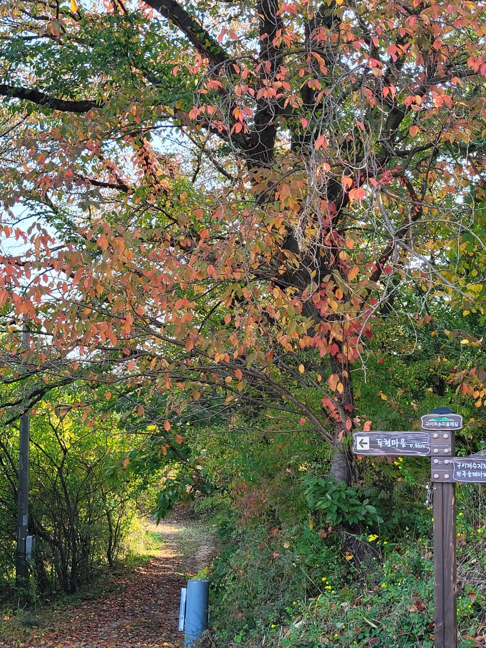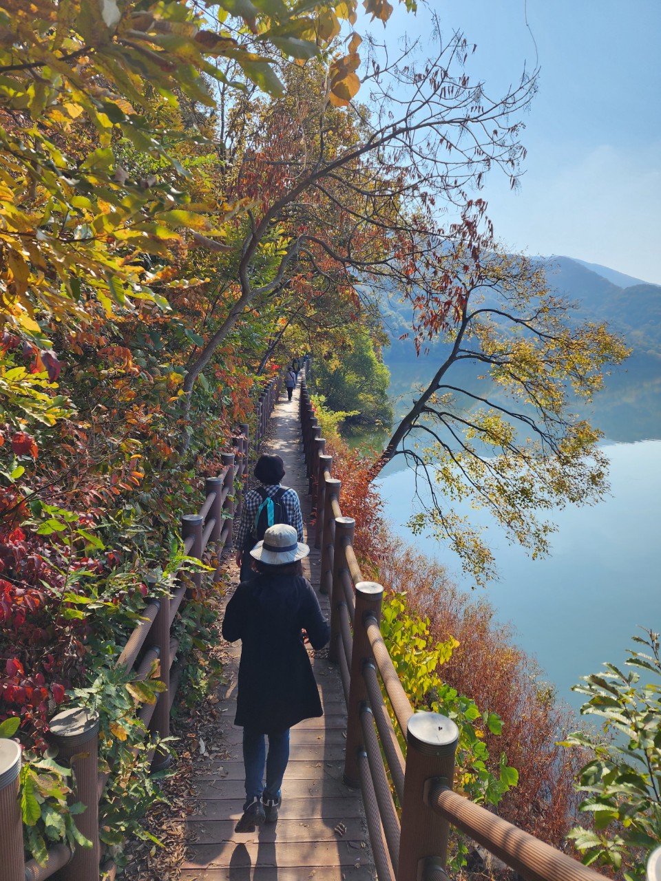 구이면 저수지 둘레길은 원점 회귀길이라 조금 지루할 수 있지만, 흙길과 데코길이 적절하게 어우러져 있고 가을 단풍들과