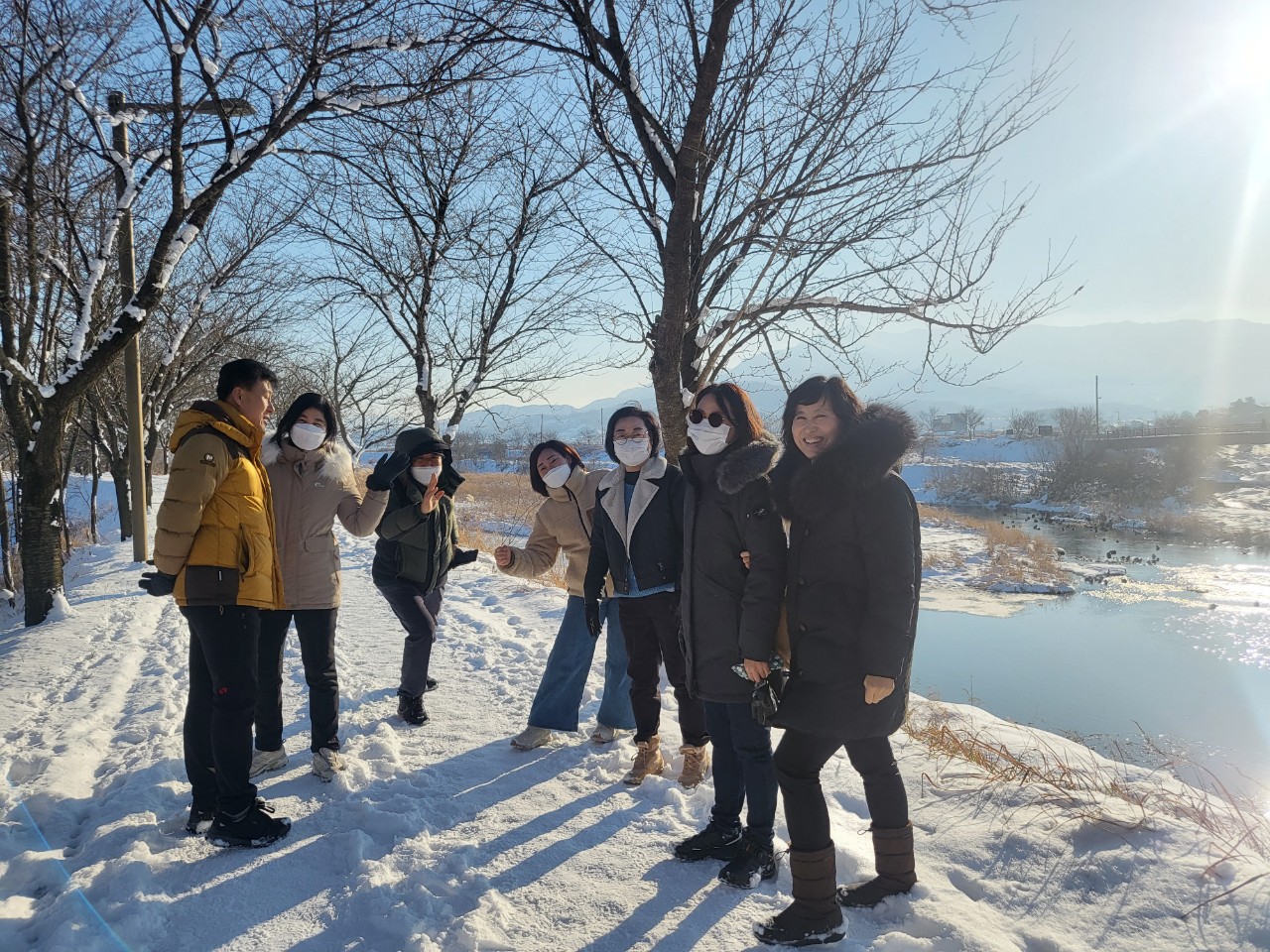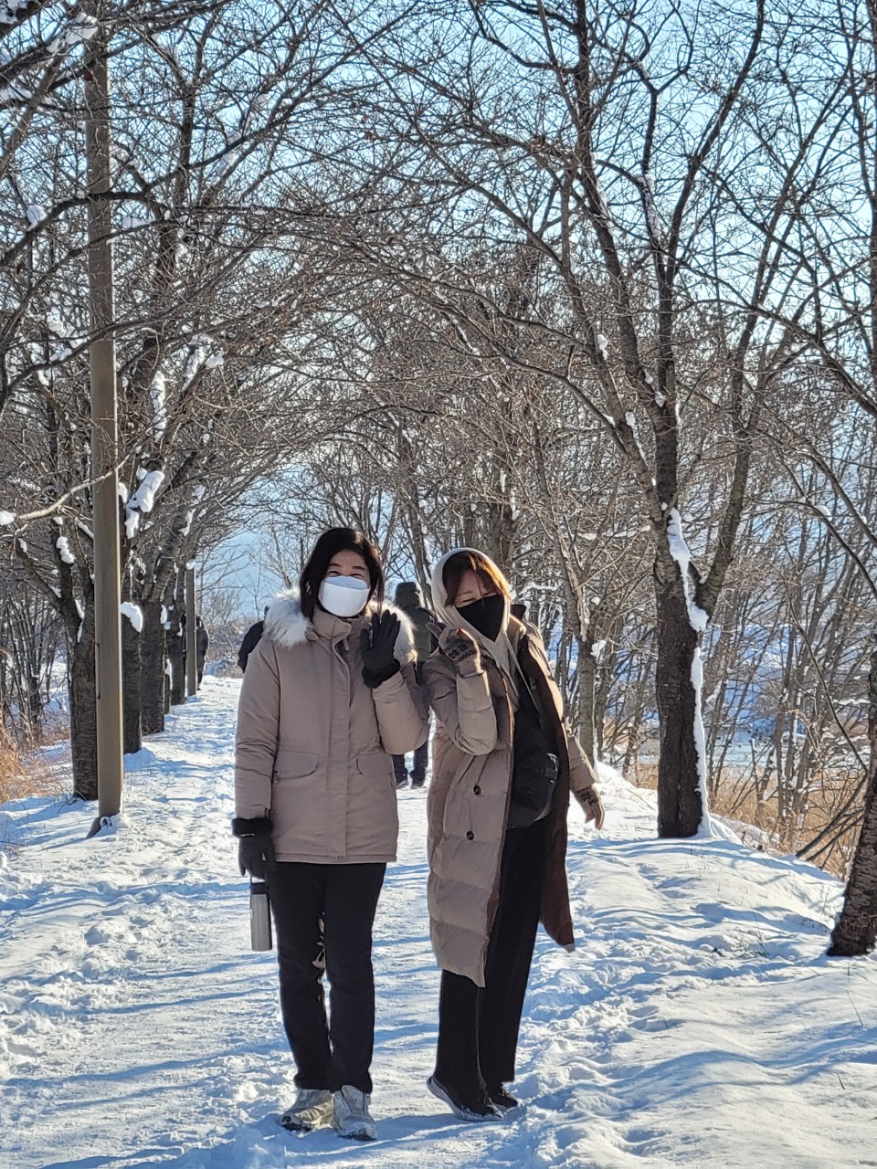 걱정스러운 날씨에 걷기를 망설였던 몇몇 회원들은 걷지 말고 송년 모임을 바로 하자는 의견이 있었지만, 웬걸요 삼천 천변길의 온순한 성품에 이내 감탄사만 연발합니다. 20년 만에 이런 길을 걸어 본다는 둥, 눈이 너무 깨끗해서 먹고 싶다는 둥, 눈위를 걸으면 칼로리 소모가 더 잘 된다는 둥, 오늘 안 왔으면 후회할 뻔했다는 둥, 진짜 안왔으면 어쨌을 뻔!.