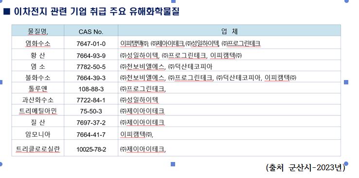 이차전지특화단지 선정으로 지역의 산업경제 새롭게 전환하는 것도 중요하지만 안전하고 지속가능한지에 지역사회의 관심이 더욱 필요하다. 지난해 군산의 천보BLS에서 5월과 6월 두 차례에 걸쳐 염소가스(4㎏)와 배터리 액상 전해질에 들어가는 클로로에틸렌카보네이크(310㎏) 물질이 유출되는 사고가 발생했다. 언론에 보도가 되기는 했지만, 안전사고 예방과 사고가 발생했을 때 대응 할 수 있는 역량이 충분한지 점검해 볼 일이다. 관련기업의 유해물질 취급 현황 등을 살펴보자.