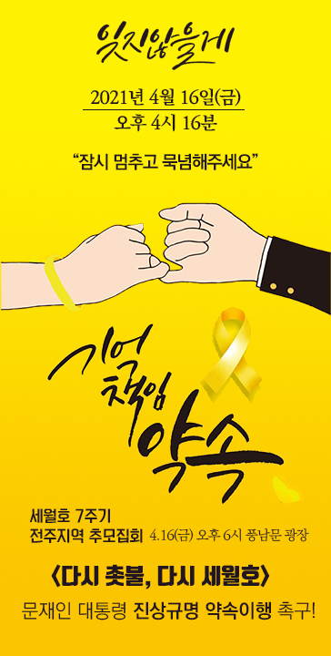 세월호 7주기 전주지역 추모집회 2021. 4. 16. 10:50 세월호 7주기 전주지역 추모집회 <다시 촛불, 다시 세월호> "문재인 대통령 진상규명 약속 이행 촉구!" 2021. 4. 16.(금) 저녁6시 전주 풍남문광장 공유하기 게시글 관리 참여자치전북시민연대